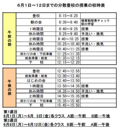 引き続き、新型コロナウイルス感染症の拡大防止のため、1学級をA班・B班の2つに分けて分散登校します。前週とは交代で、B班が午前・A班が午後になります。