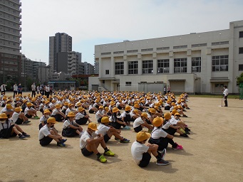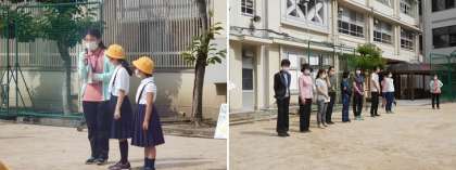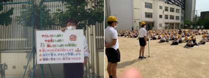 6月15日(月)今年度初めて全校児童が集まったので、運動場で着任式と始業式をしました。