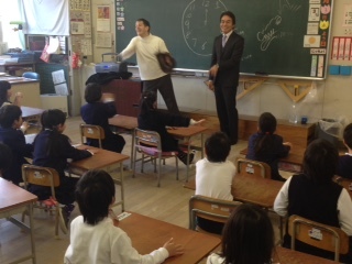 2時間目の1年生の授業に飛び入り参加し、子どもたちと一緒に英語活動を楽しんでいただきました。