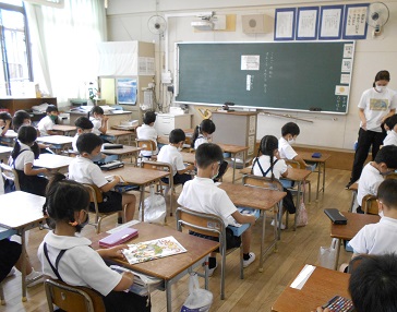 教室で放送を聞いている子ども達に対して、日本では「おはよう」という挨拶の言葉、フランス語やドイツ語、韓国語、中国語などの朝の挨拶の言葉を紹介し、笑顔で元気よく挨拶ができるように頑張ってほしいと言いました。