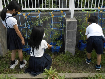 中には赤色や橙色に熟し始めた実もあります。子ども達も色の変わるのを楽しみにしています。