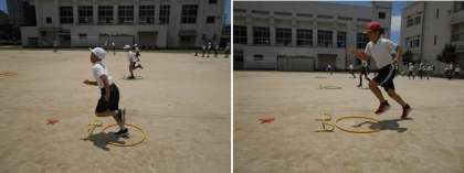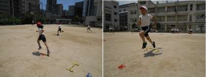 ハードルなしでタイムを計った後、一定の間隔に置いた小型のハードルを調子よく跳び越えながら、最初のタイムにどれだけ近づくことができるか挑戦していました。