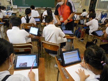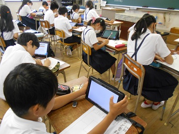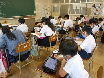 7月14日(火)5年生が社会科(総合的な学習)「自然条件と人々のくらし」の学習で、タブレットPCを使って、沖縄について調べていました。