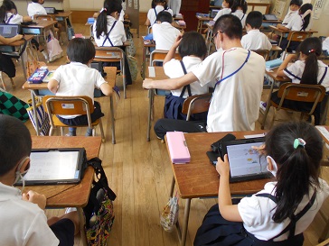 7月17日(金)1年生がタブレットを使って夏のイラストを見つけ、それをもとにはがきに絵を描いていました。