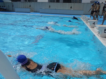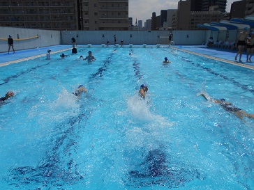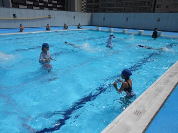 7月21日(火)今日も朝から真夏のお天気と暑さで、5年生が気持ちよさそうに体育科「水泳運動−クロール」の練習で、水しぶきをあげていました。腕のかき方や息継ぎの仕方など少しずつ上手になり、長い距離を泳げるようになってきました。