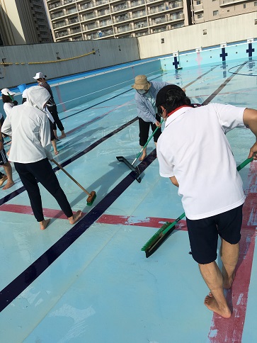 来週からも5・6年生が気持ちよく水泳運動できるように、教員みんなでしっかり磨きました。