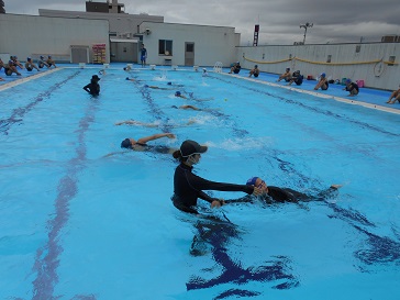 7月27日(月)朝から雨が上がり、曇り空のもとで6年生が体育科「水泳運動」の学習をしていました。