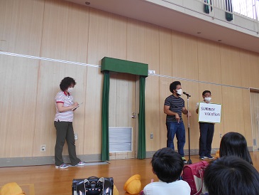 次に、「summer vacation」という言葉をもとに、Mr.Aにカナダの夏休みについて英語で話してもらい、短い夏休みをゆっくり楽しんでほしいと子ども達に言いました。