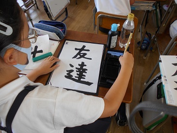 「友」の字の左払い・右払い、「達」の字のしんにょうの筆の使い方に気をつけて、丁寧に書き上げていました。