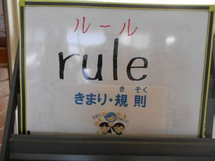 ruleは「きまりや規則」の意味であり、日本語としても定着している。私たちの生活の中でも、集団登校や交通規則、学校生活の中でも学習の仕方や廊下階段の歩行など様々なルールがある。なぜルールがあるのか、それはみんなが安心で安全に生活するためであり、それを守ることは大切なことであるという話をしました。