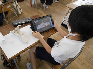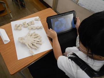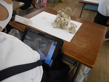 粘土を手で握って、できた形をもとにいろいろな造形遊びをしていました。できた作品をタブレットで撮影し、名前をつけていました。