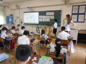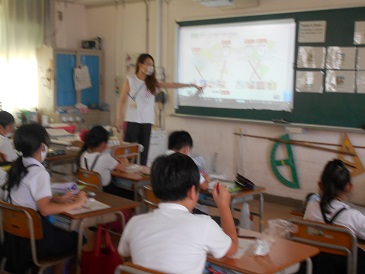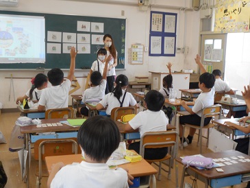 一日の生活の時間の英語での言い方「wake up time」や「lunch time」などを教わり、互いに言い合ったり、映像を見てその時刻を考えたりして、時刻の言い方を学習していました。