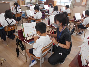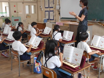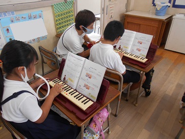 9月7日(月)2年生が音楽科「かっこう」の学習を鍵盤ハーモニカを使ってしていました。指の使い方を丁寧に教えてもらっていました。