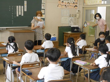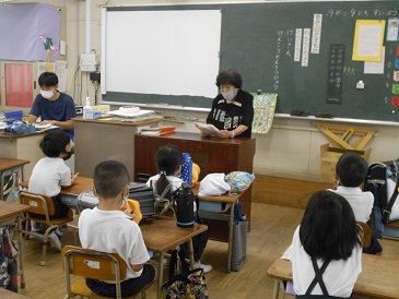 9月9日(水)お話ボランティアの方が来られ、朝の読書タイムに1年生へ物語を読んでいただきました。