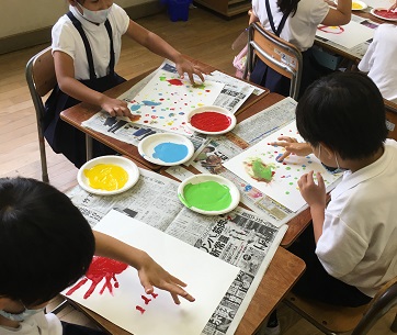 「えのぐをつかって、てやゆびでかくきもちよさをかんじてたのしむ」ことをめあてに、画用紙に絵の具でいろいろな絵や図を描いていました。楽しそうですね。