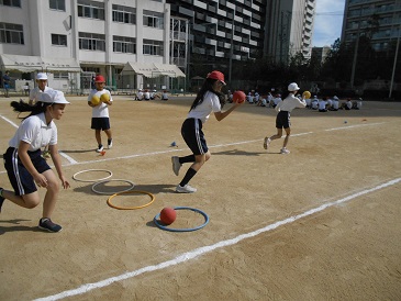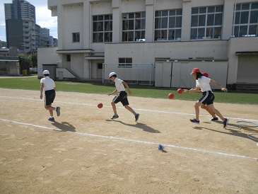 トラック一周するのですが、スキップや片足とび、両足とび、ボールをドリブルするなど様々な動きを取り入れて競走します。