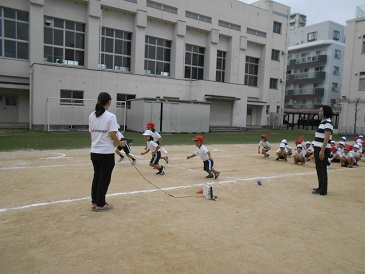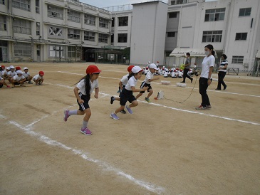 9月16日(水)1年生が体育の時間に、運動会でする「かけっこ・リレー」の練習をしていました。どの子も一生懸命に走っていました。玉入れリレーも楽しそうです。