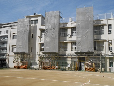 空調設備改修工事のため、校舎に足場が取り付けられました。