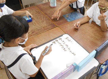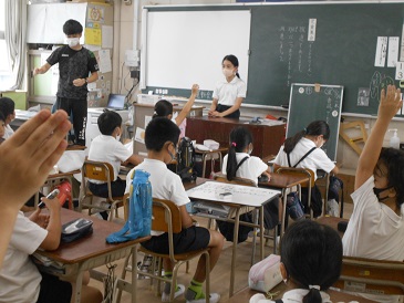 今日も各学級で校内放送を聞きながら、クラスメイトで曲のイントロを聞いて曲名を当てるクイズに答えました。
