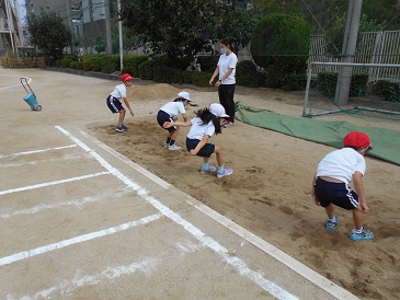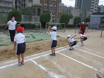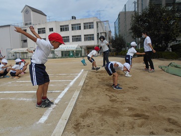 運動場の砂場で、先生から跳び方を教わり、弾みをつけるために腕を振り、体を揺らして「いち、に〜の〜お、さん!」のリズムで勢いよく前にジャンプします。