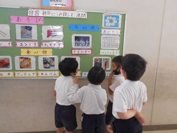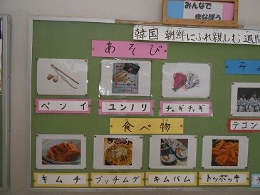 今週は「韓国・朝鮮の文化にふれ親しむ週間」です。学校の掲示板には韓国・朝鮮の遊びや食べ物、スポーツなどについて掲示しています。子ども達も興味深そうに見ていました。