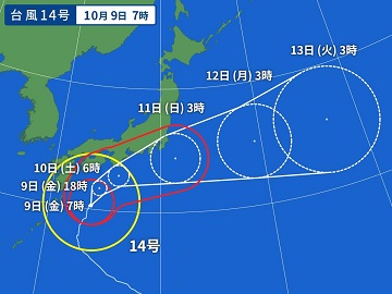 強い台風14号が近畿地方に接近してきています。今後の進路によっては、大阪への影響が考えられます。以前に配付しました「(保存版)非常変災時の措置についてのお知らせ」を再度ご確認ください。(この画面右下「お知らせ」欄にも掲載しています。)