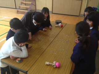地域の方に先生としてお越しいただき、1年生に昔遊びを教えていただきました。けん玉・あやとり・こままわし・はねつき・おはじき・めんこ・お手玉の7種類の昔遊びです。なかなかうまくいかない子どもたちに手取り足取り教えてくださいました。子どもたちは、「やった〜」「できた!」と大喜びです。