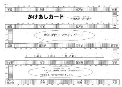 かけあし運動に合わせて、子どもたちに「かけあしカード」を配っています。運動場を1周すれば1コマ色を塗っていきます。カードは大阪駅スタート・大阪駅ゴールの環状線1周の旅になっています。子どもたちの励みになっています。お子様のカードを見て、ぜひ、励ましの言葉をかけてあげてください。