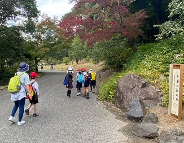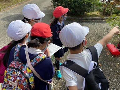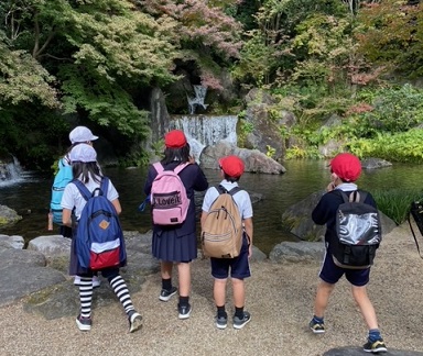 万博記念公園の日本庭園の中で、3・4年生合同の班になって、オリエンテーリングを楽しみました。少し木の葉の色が変わってきている様子も見られました。