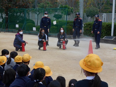 火災はいつ起こるかわかりません。遊んでいる時でも緊急避難の放送が入れば、適切に行動できるようにすることを目的に訓練を行いました。運動場にいた子も教室にいた子も素早く避難することができました。消防署員の方からもお話をいただき、最後に職員が消火器の使い方の訓練をして終わりました。