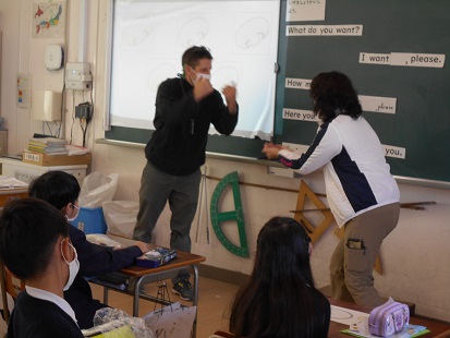 NS(英語講師)のマッツ先生に来ていただき、野菜やフルーツの名前をもとに、クイズや買い物の会話の仕方を考えたり、ゲームをしたりして楽しみました。