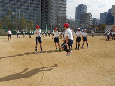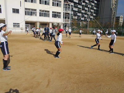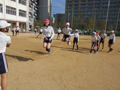 12月7日(月)6年生が体育科「たくみな動きを高める運動」の学習で、長なわとびを工夫して跳んでいました。この写真は長なわを跳んだ後、回す人と素早く交代して、なわを回すという運動です。なかなか難しい動きです。