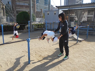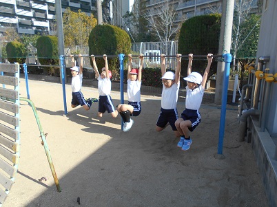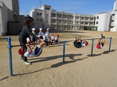 12月9日(水)2年生が体育科「てつぼうあそび」の学習をしていました。「こうもり」「さる」「ぶたのまるやき」など動物をまねて、いろいろなぶら下がり方に挑戦していました。