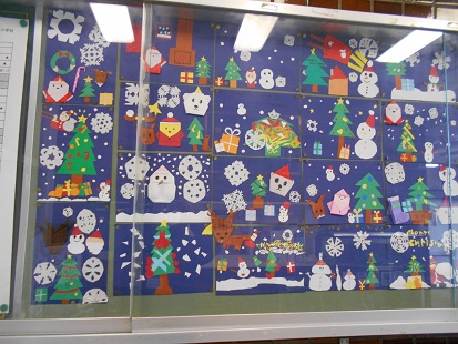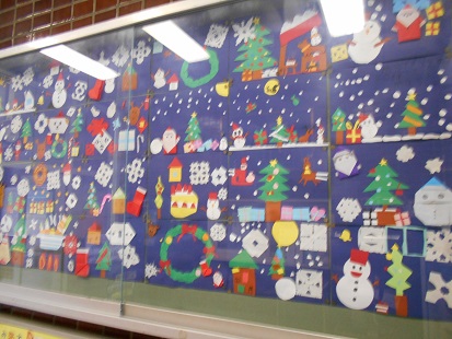 玄関の掲示板に12月の掲示がされています。子ども達が楽しみにしているクリスマスバージョンです。4年生が作ったサンタクロースやクリスマスツリー、雪だるま、雪の結晶などの切り絵がちりばめられています。きれいですね。
