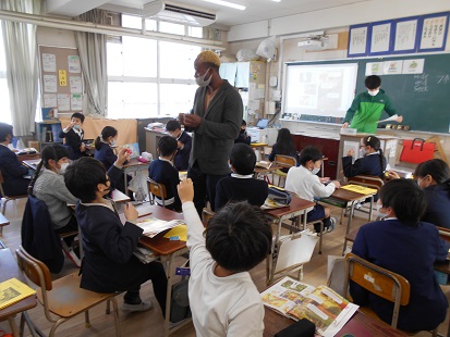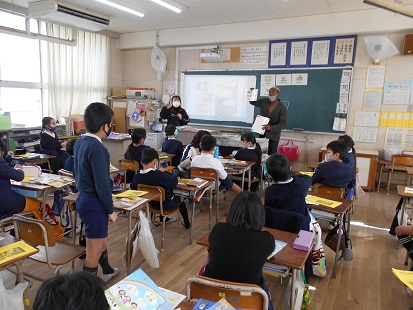 12月15日(火)3年生が、英語講師のゼイン先生に来ていただき、外国語活動の学習をしていました。短いお話を聞いて、その中にいる十二支の動物の名前やその形の特徴を言ったり、その場所を当てたりして楽しみました。