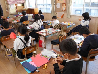 2年生が図画工作の学習で、ストローを使って動く仕組みをつくっています。太いストローと細いストローを使います。動く仕組みができたら、動きに合わせた飾りつけをします。セロテープを使って、うまく動かすことができるように試行錯誤しています。どんな作品に仕上がるのか、楽しみです。
