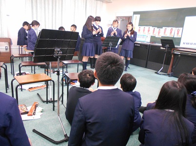 12月23日(水)6年2組の児童が音楽の時間に「楽しい音楽会」を開きました。普段の音楽の学習で学んだ曲を合奏したり、合唱したりして、先生方に聞いてもらいました。
