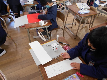 白ボール紙を使い、展開図をもとにハサミで紙を切って、上手に四角い箱を組み立て、黒や赤のさいの目を貼り付けていました。このあと双六づくりもするようです。