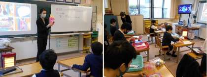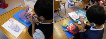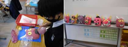 1月21日(木)なかよし学級でなかよしタイムに研究授業が行われました。掲示板に貼る2月の掲示物「オニのお面をつくろう!」でした。予め自分で考えたオニの絵をもとに、粘土に絵の具を混ぜて彩色しました。今日はその色粘土を土台に貼り付けてお面を完成させます。目や鼻、口、角など思い思いの形に付けて、一人一人の個性豊かなオニのお面が出来上がりました。