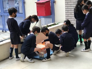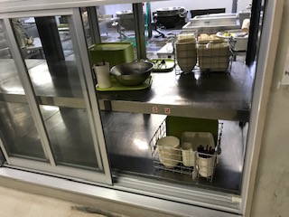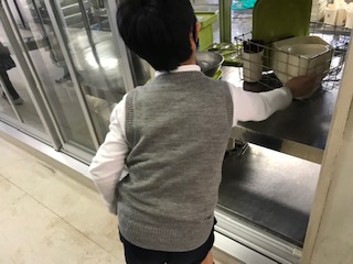 安全に廊下階段を通って給食室に到着したら、使った食器や食缶、牛乳パックのかごを決められた場所に返却します。この時も、扉向こうの給食調理員さんにとってもらいやすいように、また、後にくる学級のことを考えておくに並べます。牛乳パックもきれいに並べています。