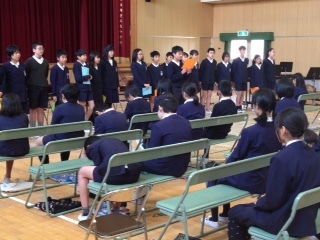 6年生が学習参観で「合奏と名言を送る会」を実施しました。多くの名言の中から自分の好きな名言を選んで、なぜその名言を選んだか、その理由と中学生に向けての希望や決意を語ってくれました。そして最後に、今日見に来てくださった両親に心からの感謝の気持ちを伝えました。