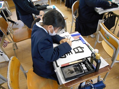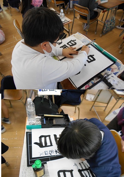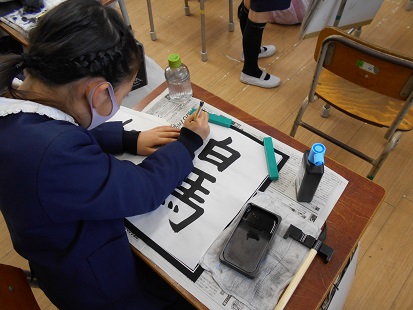 2月2日(火)4年生が書写「白馬」の学習をしていました。文字の大きさに気をつけて書くことが目標でした。画数の少ない「白」と画数の多い「馬」では、白を馬より小さめに書いた方がつり合いが取れて、美しい文字の並びになるということです。みんなそんな意識をして丁寧に清書していました。