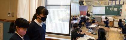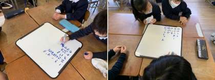 いつものようにTeamsを使って、学級ごとに画面を見てクイズに答えます。今日はゲーム名のように、実物や写真の一部分をカメラで映し、それが何かを当てるクイズでした。1年生もグループで相談してホワイトボードに答えを書いていました。