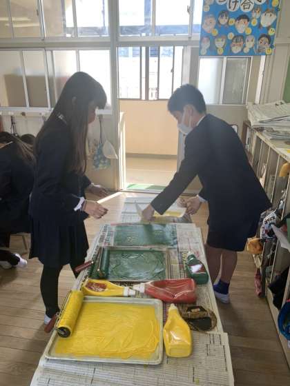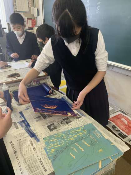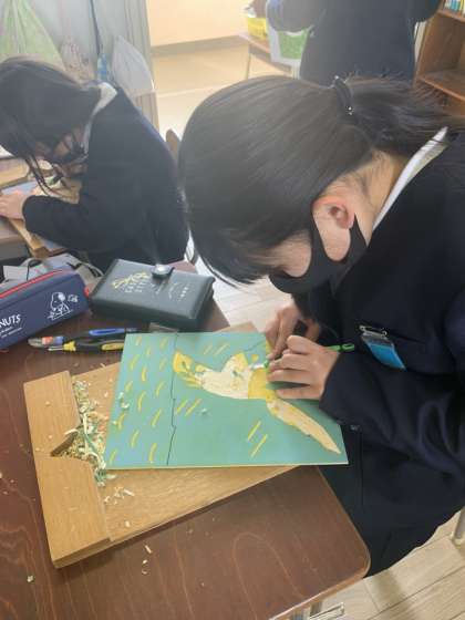 この時期は、どの学年でも発達段階に応じた版画を学んでいます。5年は、多色刷りの版画で作品を仕上げています。さて、さて、名画を版画に、の題材名ですが、どんな作品ができるのでしょうか?楽しみです。