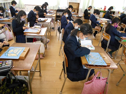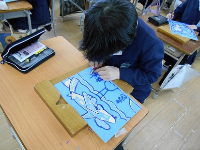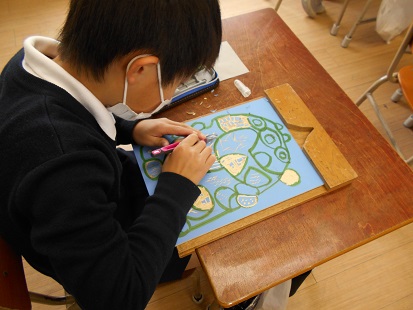 一筆画で描いた絵や模様を、丸刀や角刀、平刀など刃先の違う彫刻刀で表現の仕方を工夫し、丁寧に彫り進めていました。どんな風に仕上がるのかとても楽しみです。