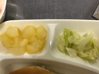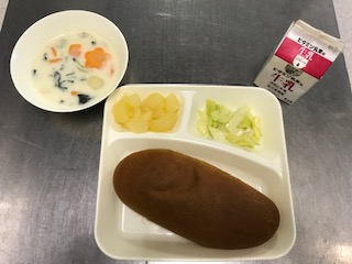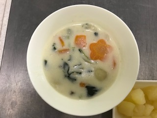 ほうれん草のクリームシチュー、キャベツのサラダ、洋梨、黒糖パン のメニューです。シチューには、お花形のラッキーにんじんがあります。調理員さんがていねいに心を込めてくださっています。これが入っていたら、ラッキー!です。キャベツも甘酸っぱくてさっぱりしていました。もりつけの彩りが華やかな給食です。