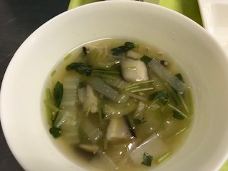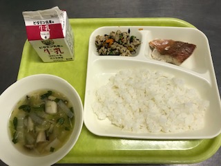 赤魚のレモンじょうゆがけ、うすくず汁、高野豆腐のいり煮、ごはん の献立でした。とろりとしたくず汁は、体が温まりました。高野豆腐のいり煮はふんわりと味も食感も柔らかく、ごはんにまぶしてもとても美味しく食べることができました。純和風ですこし懐かしいほっこりする味わいでした。