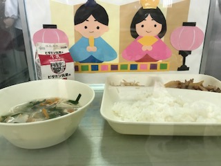 いよいよ3月です。校内には、3月の掲示に変わったところがいっぱいです。給食サンプルケースには、雛人形の可愛らしい姿があります。ほんのりあたたかい陽差しが春の訪れを実感させてくれます。