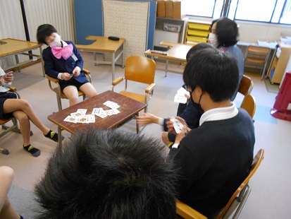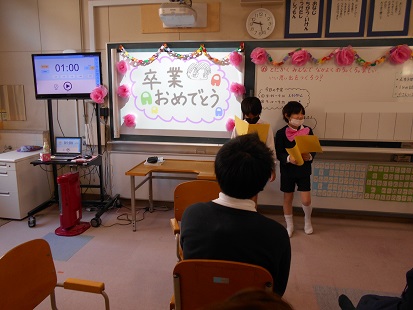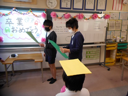 なかよし学級で、卒業する6年生と在校生との交流の会がありました。楽しいゲームをした後、感謝のメッセージカードを渡していました。