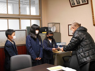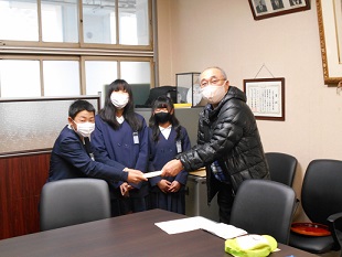 学校に同窓会長の中村さんが来てくださり、学級代表の3人が同窓会への入会手続きを行いました。中村さんから、「海老江東小学校の卒業生として、中学校でもがんばってください!」と、励ましの言葉をかけていただきました。
